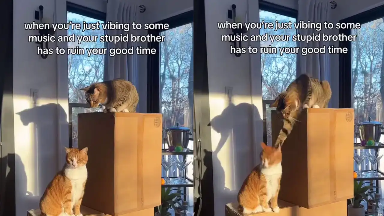 В уютном доме царит веселье, но один котофей явно недоволен. Его собрат, полный энергии и радости, пританцовывает под музыку, что вызывает бурю эмоций у завистливого друга. Кот с недовольным взглядом и шевелящимися усами демонстрирует все грани своего недовольства: от раздражительного взгляда до ударов лапой.
