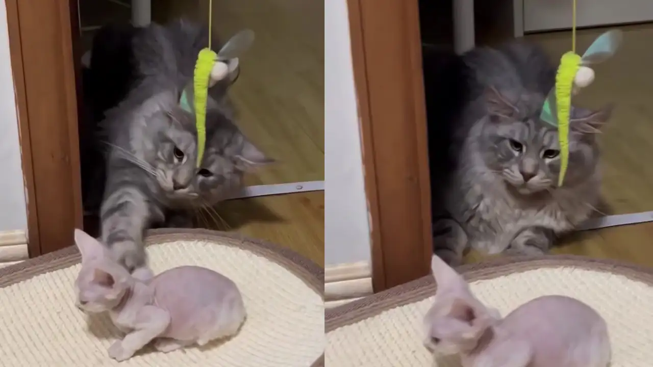 Большой кот буквально застыл в изумлении, пытаясь понять, что это за странное, гладкое создание появилось на его территории. Кажется, его представления о кошачьем мире были разрушены в один миг. Это же не может быть настоящим котенком!