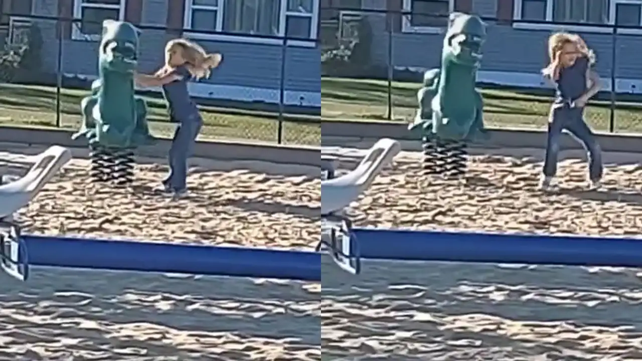 На детской площадке девочка раскачивает динозавра на пружине, чтобы не танцевать одной. Ее смех и радость передаются зрителям через экран.