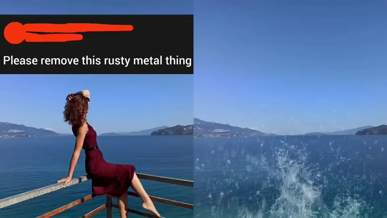 Девушка решила сделать необычный запрос на редактирование своего фото: убрать перила на снимке, где она сидит на берегу океана. В результате получился оригинальный ролик, в котором редактируют изображение так, что в конце девушка падает в воду потому, что ей просто не на чем сидеть.