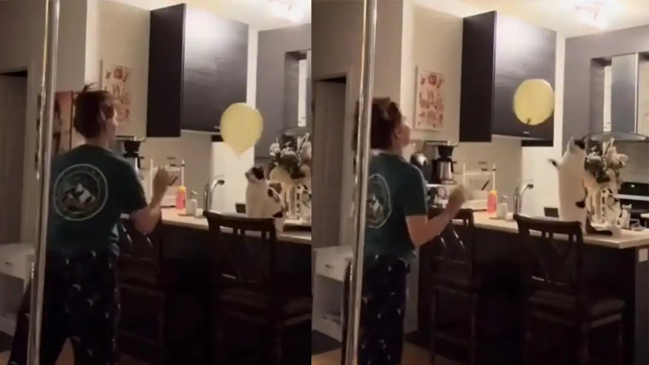 Удар, прием, снова удар, и все это без сетки, мяча и даже спортивной формы. На обычной кухне прошел самый милый волейбольный матч на свете. С одной стороны — кошка с «лицом» олимпийской чемпионки, а с другой ее хозяйка. Вместо мяча у спортсменок — воздушный шарик, а вместо судьи — камера, фиксирующая каждое движение.