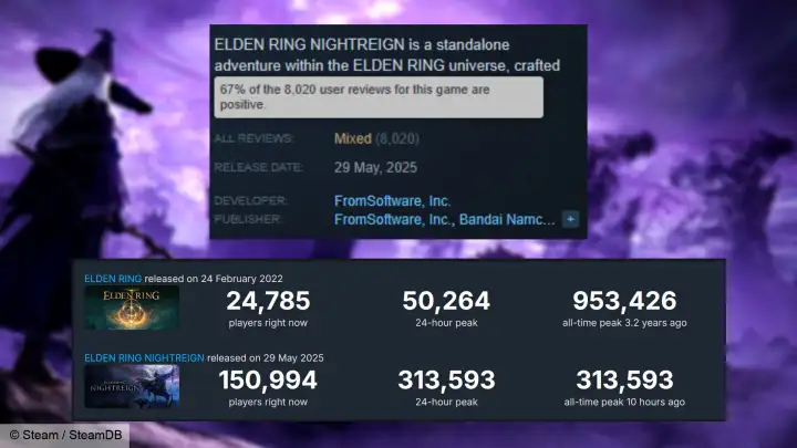 Трудно сказать, кто является целевой аудиторией новой игры, поскольку она всё ещё слишком сложна и этим отпугивает новичков, но в то же время не обеспечивает достаточного количества интересных сборок и развития для ветеранов Soulslike-игр. На момент написания статьи Nightreign достигла пика в 313 593 игроков — это далеко от пика Elden Ring в 953 426 человек, хотя и не худший показатель в истории видеоигр в целом. Однако отзывы в Steam вполне однозначны: лишь 67% пользователей рекомендуют проект, что делает Nightreign наихудшей игрой FromSoftware на данный момент.