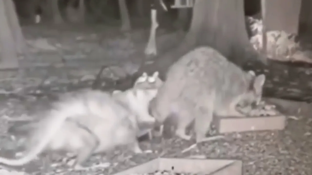Фотоловушка запечатлела курьезный момент: опоссум, явно голодный, решает «проверить» енота на предмет вкусности. Он подходит сзади и щипает енота за причинное место. Реакция енота непередаваема — он в замешательстве пытается понять, что происходит, но кидается на своего обидчика.