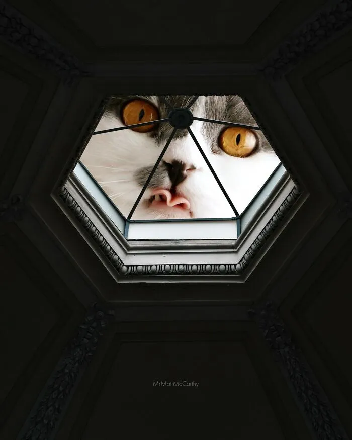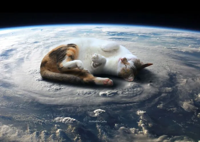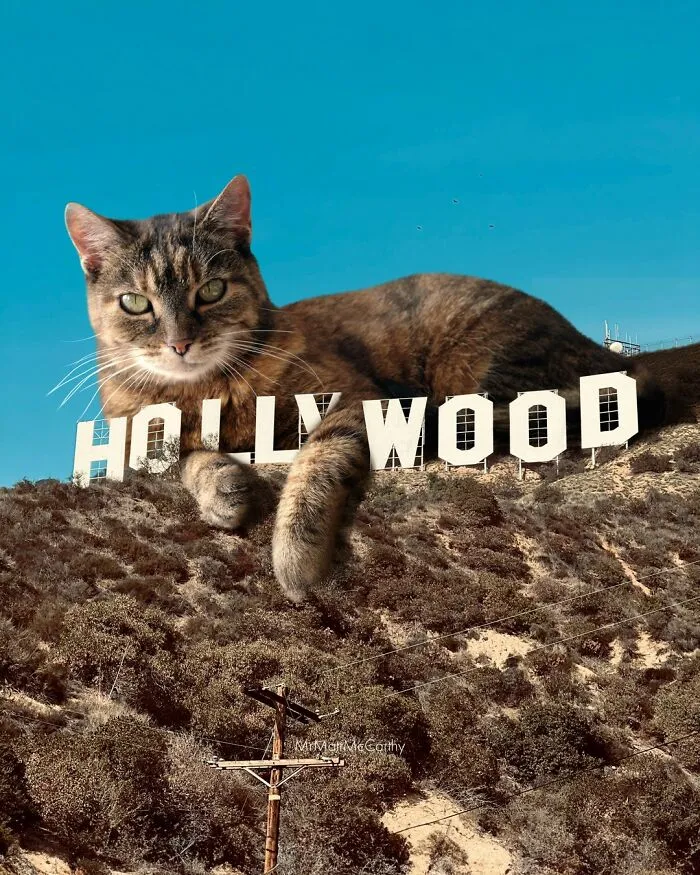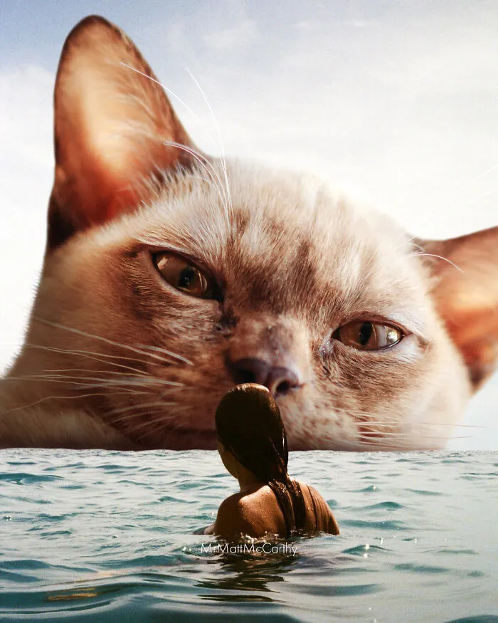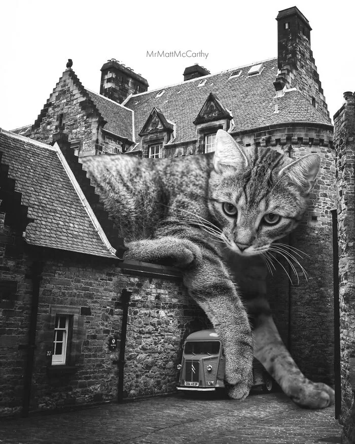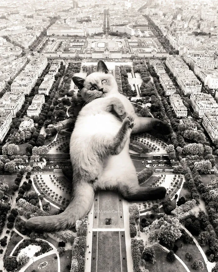 Думая о кошках, мы всегда представляем себе их милую внешность и причудливые повадки. Однако мы часто упускаем из виду тот факт, что они — хищники. Если бы кошки были крупнее, наше восприятие этих животных было бы совсем другим. Вдохновленный этой идеей, художник Мэтт Маккарти стал создавать забавные сюрреалистические изображения с гигантскими кошками, которые правят миром.