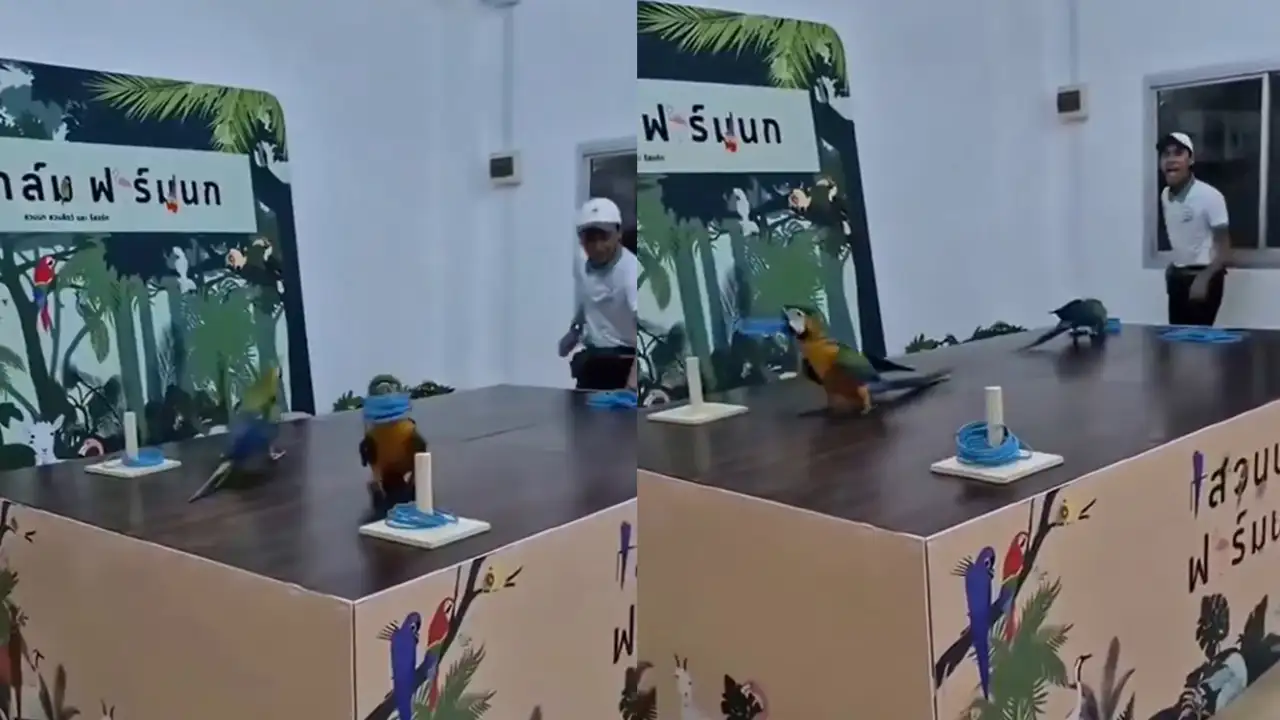 Попугай явно доволен своим успехом, демонстрируя самодовольство после удачного маневра. Этот птичий поединок показывает, что интеллект и изворотливость присущи не только людям.