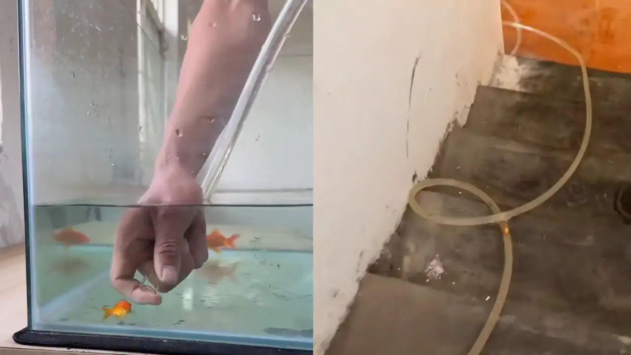 Один изобретательный хозяин решил устроить своим рыбкам настоящее мини-путешествие, применив весьма оригинальный метод транспортировки. Он протянул длинный шланг со второго этажа дома на первый, создав необычный водный путь.
