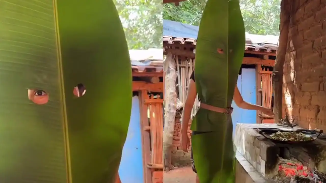 Хозяйка демонстрирует оригинальный способ защиты от брызг горячего масла во время готовки. Она прикрепила к себе огромный лист растения ремнем, сделав отверстия для глаз. Этот креативный подход вызывает смех и удивление у зрителей.