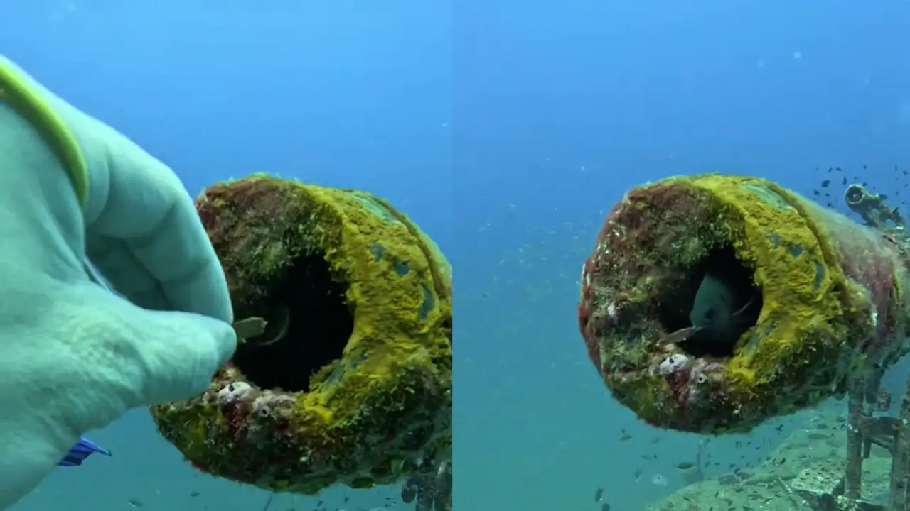 На видео рыбка-чистюля активно борется с мусором в своем доме. Она настойчиво выбрасывает мусор, который ей подкидывает дайвер, демонстрируя удивительное поведение и интеллект.