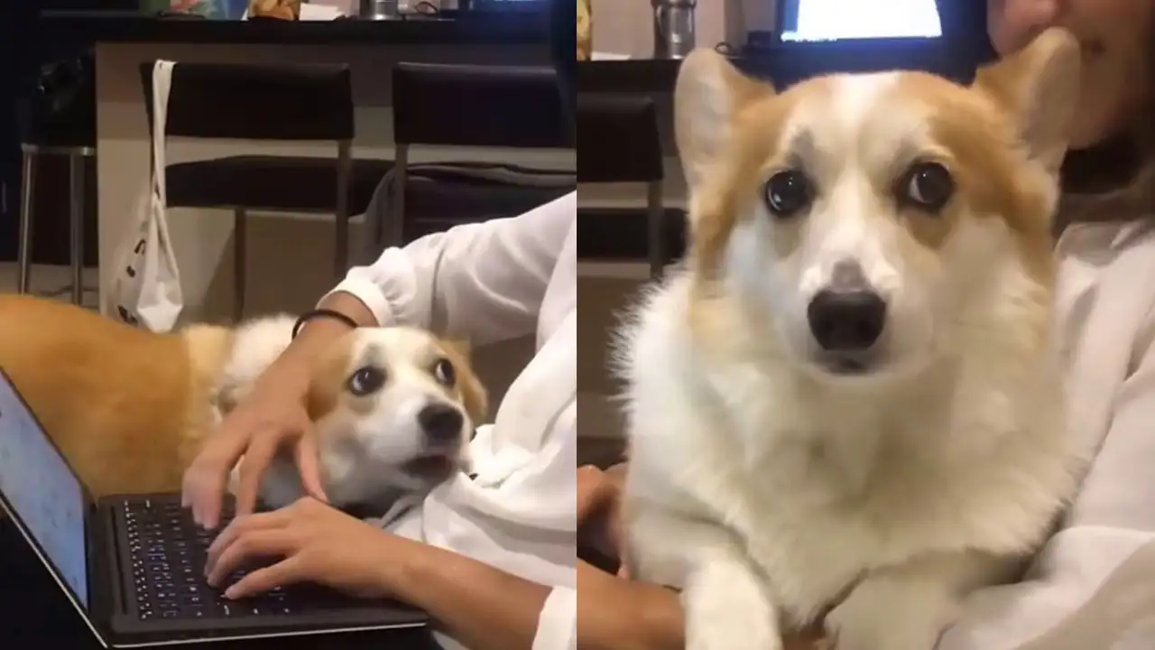 Корги с жалобным взглядом сидит около своей хозяйки, работающей за ноутбуком. Он начинает проявлять активность, подталкивая ее руки своей мордочкой и залезая к ней на руки. Кажется, он пытается сказать: «Хватит работать, пора отдыхать!»