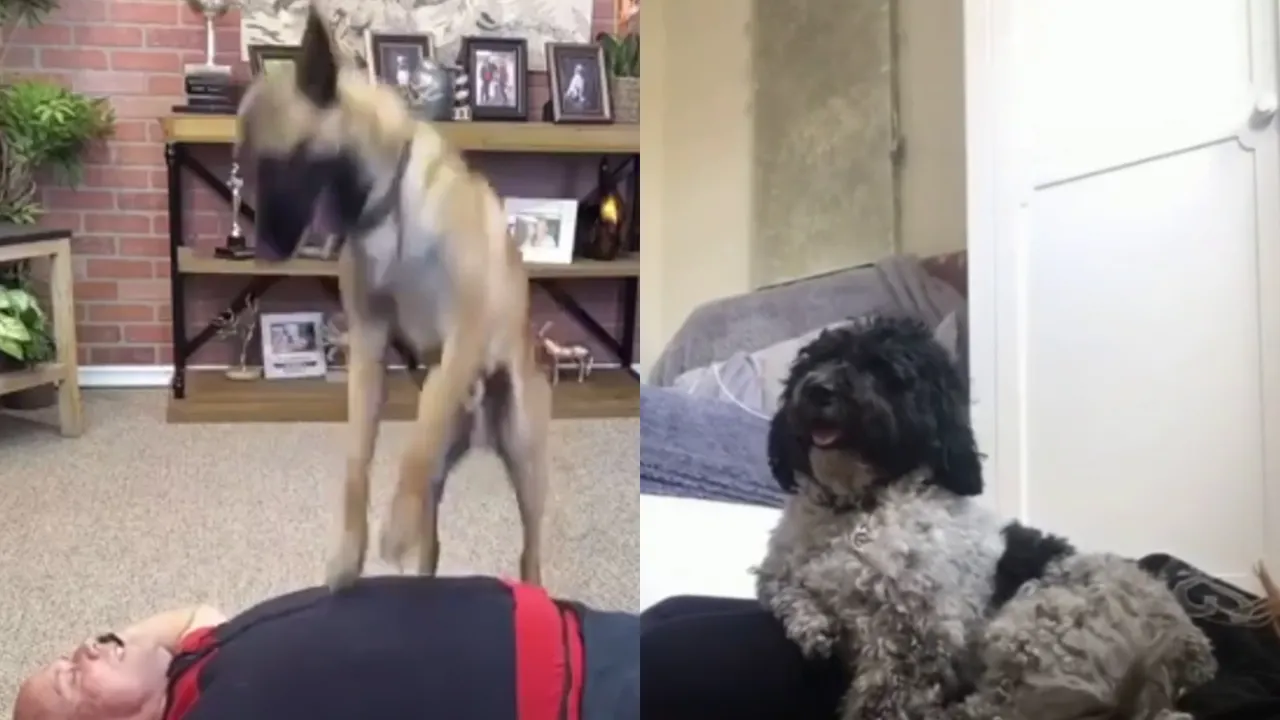 В этом ролике один песель проявляет себя как настоящий спасатель, бросаясь на помощь своему упавшему в обморок хозяину. Тогда как вторая, кажется, решила отдохнуть на своей хозяйке, прямо как на диване в подушках.