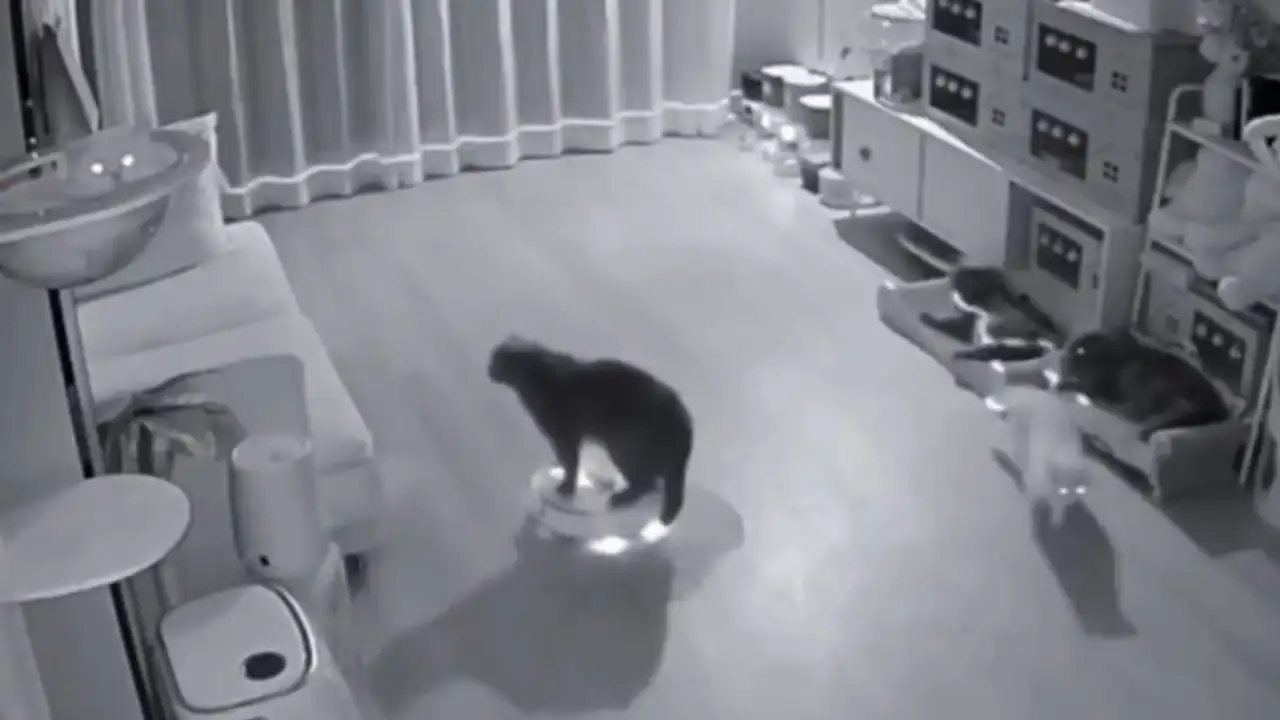 Камера ночного видения засняла, как усатые диджеи используют пылесос в качестве транспорта и... дискотечного шара, судя по лучам, которые он распространял вокруг себя.