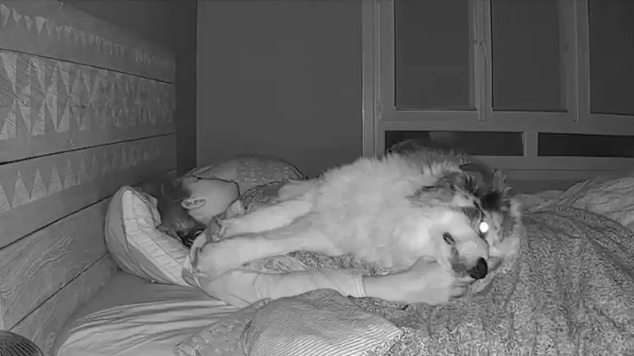 Это видео с ночной камеры наблюдения показывает, как пес изо всех сил старается помешать своей хозяйке выспаться. Он сначала ходит вокруг, затем ложится на нее, а потом вообще засыпает с ней щека к щеке. Хозяйка пытается отодвинуть его, но пес вновь возвращается, как будто это игра.