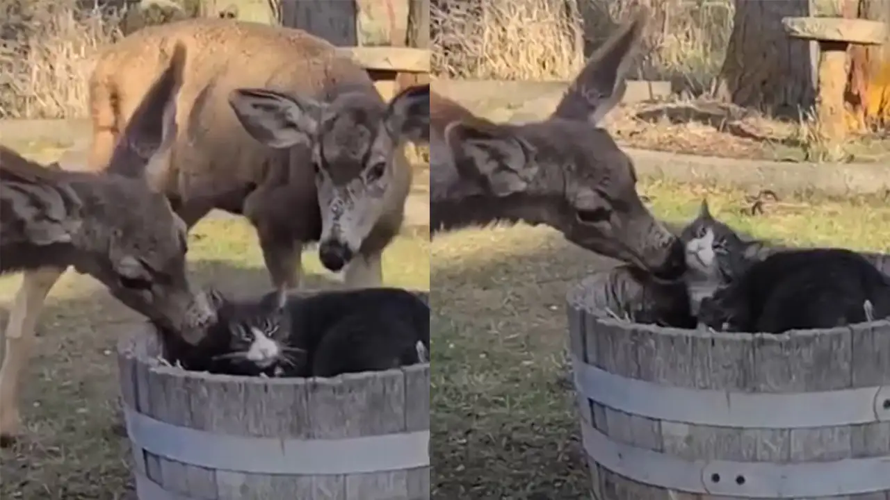 Кот по Камушек, который вместе с хозяевами живет в небольшом городке в США, стал звездой соцсетей, когда владельцы поделились роликом, где их питомец общается с двумя оленями. Олени регулярно наведываются в гости и устраивают Камушку спа-день, облизывая его с головы до лап. Милая, но немного странная дружба, заслуживающая экранизации от студии Disney.