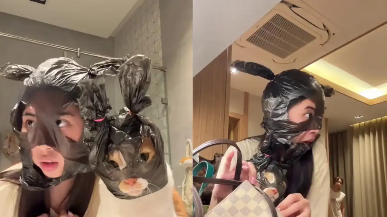 Видео демонстрирует забавный момент, когда хозяйка вместе с котом надевают маски и пытаются стащить кошелек из сумки ее матери. Она держит кота на руках, и оба выглядят как настоящие мошенники.
