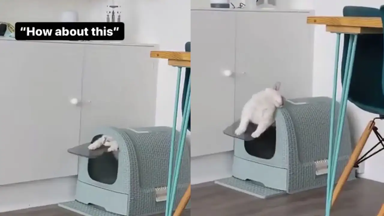 Этот забавный ролик показывает кота, который решает выбраться из лотка с котоходом нестандартным способом — сверху. Сначала он осторожно оценивает ситуацию, но вскоре понимает, что легкие пути не для него.