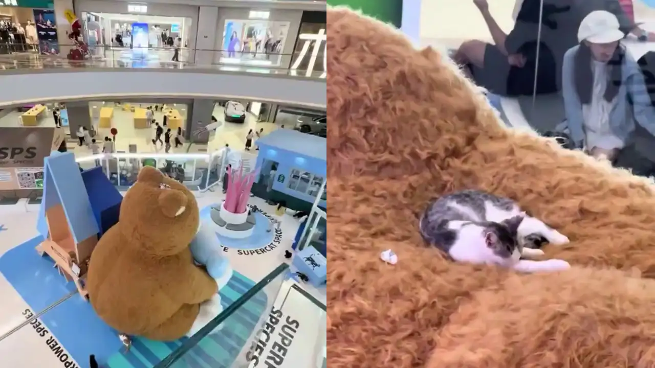 В одном из торговых центров китайского города Ханчжоу установили огромного плюшевого медведя, который пришелся по душе местному коту.