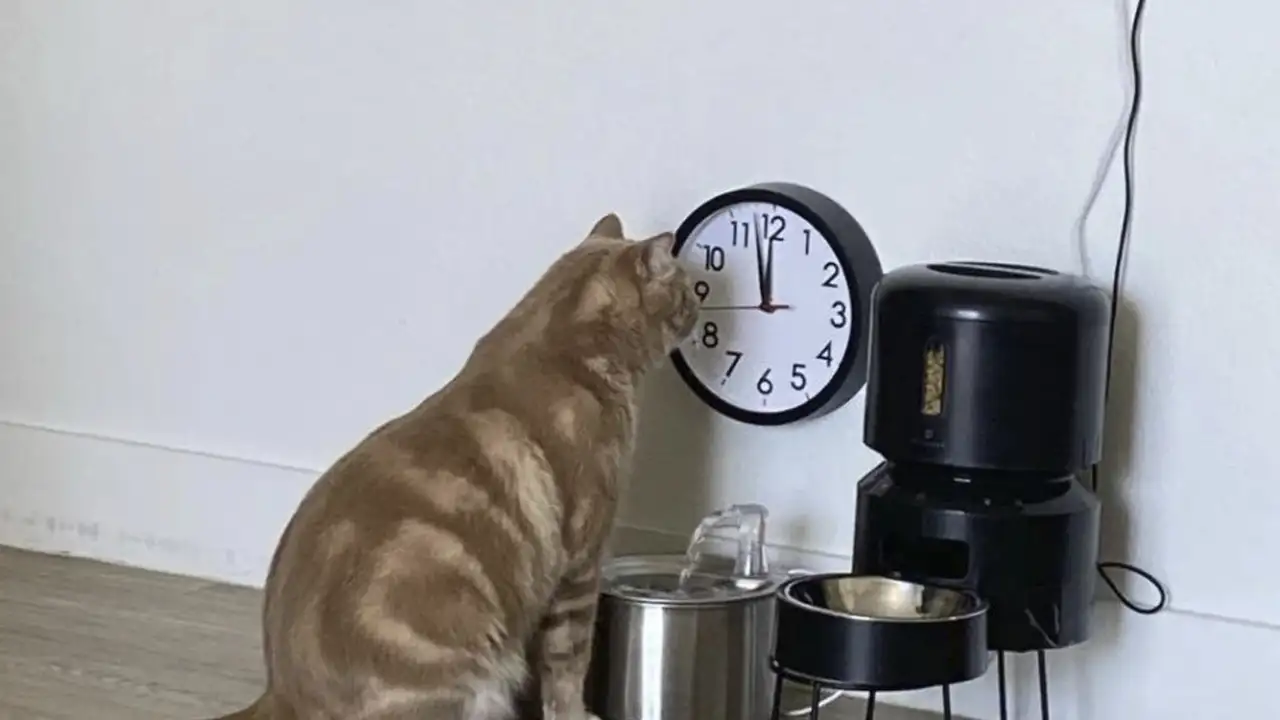 Чтобы кот не терроризировал автоматическую кормушку, ему рядом повесили часы, надеясь, что он будет знать время следующей выдачи корма. Однако, пушистые питомцы совершенно не понимают концепцию времени, поэтому он продолжает настойчиво требовать еду, несмотря на показания циферблата.