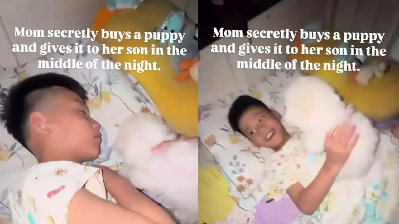 Ночью мама решила сделать сюрприз своему сыну и тихонько принесла домой щенка. Малыш даже не подозревает о подарке, когда его будят в полночь. Его сонное лицо наполняется недоумением, когда он видит перед собой маленького пушистика.