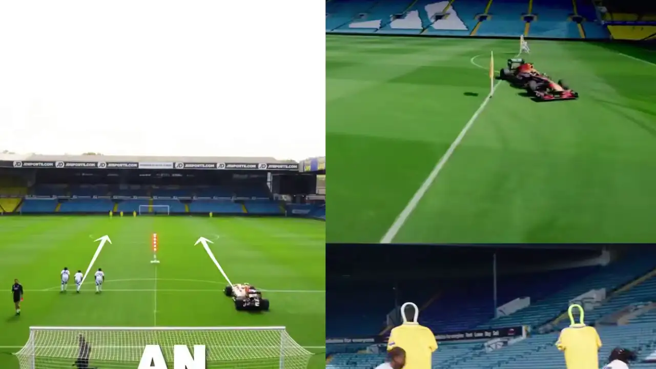 На футбольном поле разгорается нешуточное соревнование: футболисты против болида Формулы-1. Маркетологи Red Bull организовали этот необычный заезд, где спортсмены с мячом пытаются обойти мощный автомобиль.