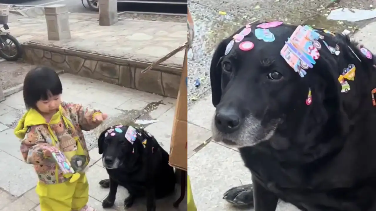 Лабрадор-ретривер оказался в роли неподвижного манекена! Девочка с сосредоточенным лицом наклеивает на него яркие наклейки, а собака лишь терпеливо ждет, чтобы не расстроить свою маленькую хозяйку.