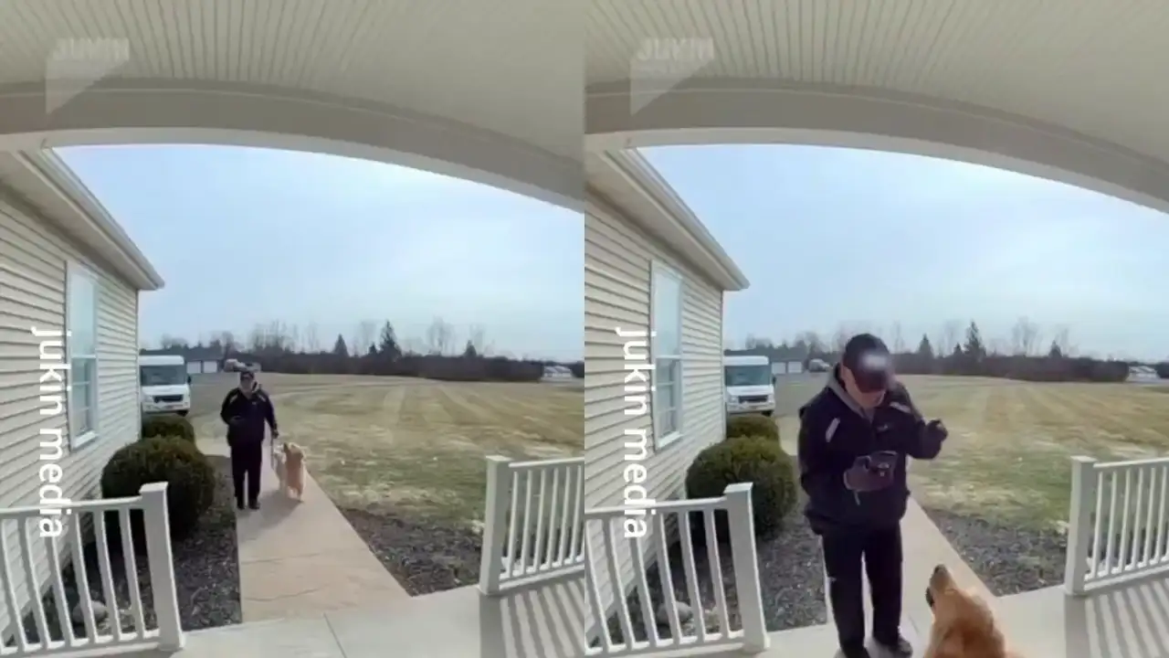 Золотистый ретривер с преданным взглядом наблюдает за курьером, который несет посылку к двери. Он настойчиво кружится вокруг, словно охранник, готовый вмешаться в любой момент.