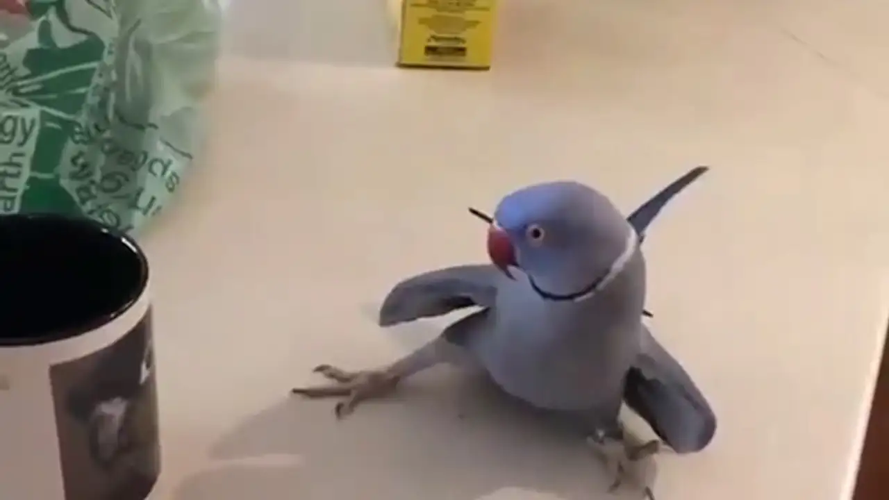 Видео демонстрирует необычный флирт: попугай явно проявляет интерес к фотографии своего сородича, изображенной на кружке. Птица внимательно изучает изображение, издает звуки, похожие на поцелуи, и ведет себя так, будто общается с живым существом.