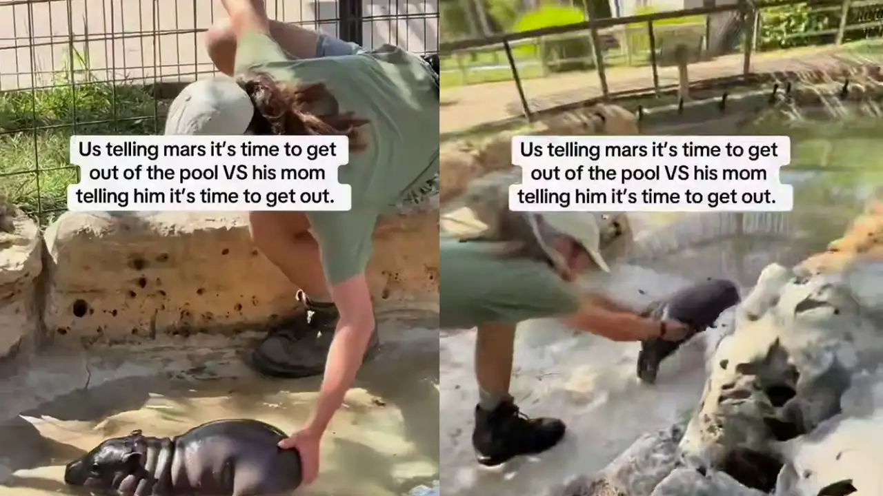 Милейшее зрелище: крошечный бегемотик, не желая покидать прохладу бассейна, демонстрирует упорство и нежелание вылезать из воды. Его попытки остаться в бассейне, несмотря на призывы, вызывают умиление и улыбку.