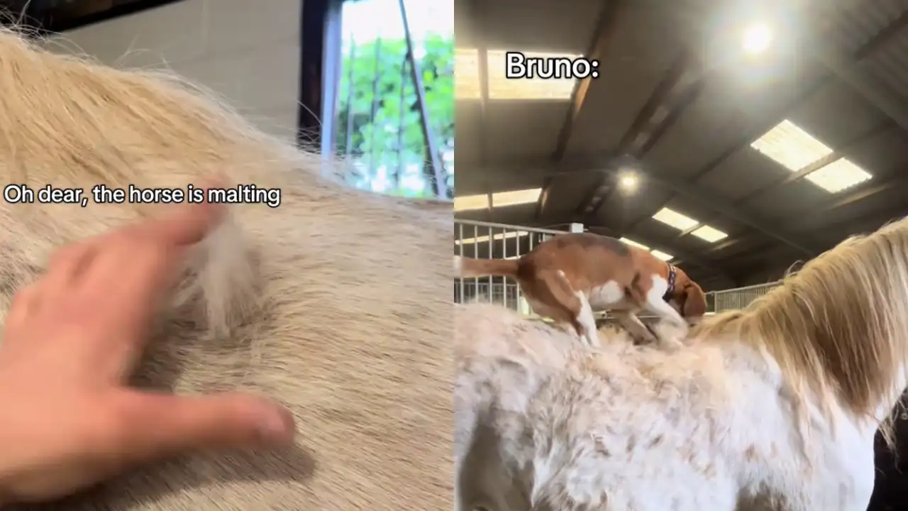 В этом забавном лайфхаке показано, как использовать активного пса для ухода за конем. Пес с удовольствием вычесывает своего четвероногого друга, стоя на нем верхом.