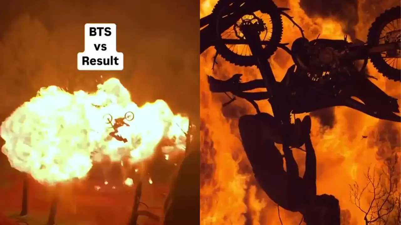 Эпичное видео демонстрирует процесс съемки трюка с прыжком в огонь на байке. Зрители становятся свидетелями захватывающего момента, когда смелый каскадер преодолевает пламя.