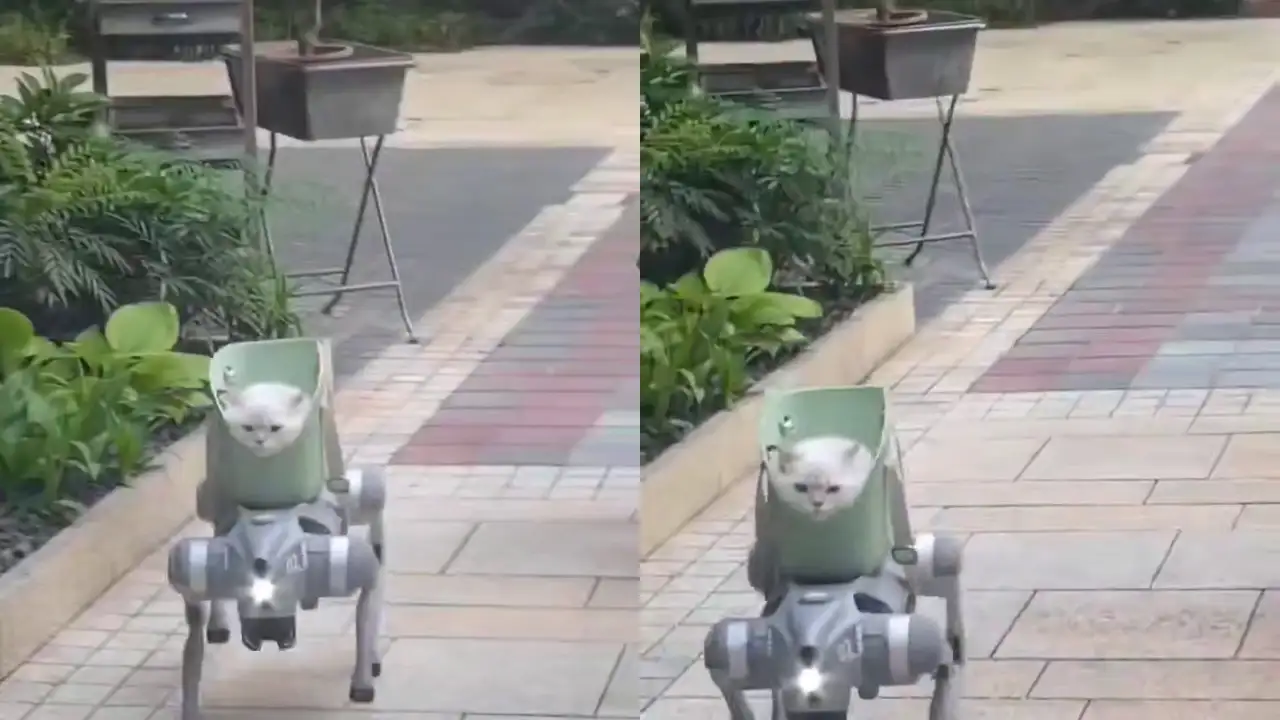 В этом видео показан робот, который выгуливает котиков. Забавный механизм с энтузиазмом везет своего пушистого друга по парку, позволяя ему наслаждаться свежим воздухом и прогулкой.