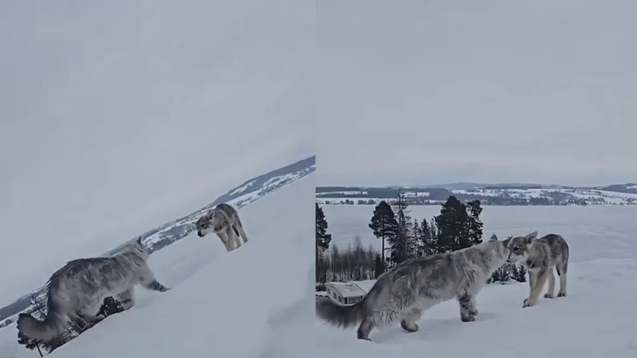 На фоне зимнего пейзажа встречаются два великолепных существа: мейн-кун и волчья собака Сарлоса. Эти грациозные животные выглядят как настоящие короли природы. Мейн-кун с его пушистым мехом и величественной осанкой привлекает внимание, в то время как волчья собака Сарлоса, обладая мощной физикой и дикой красотой, создает контраст.