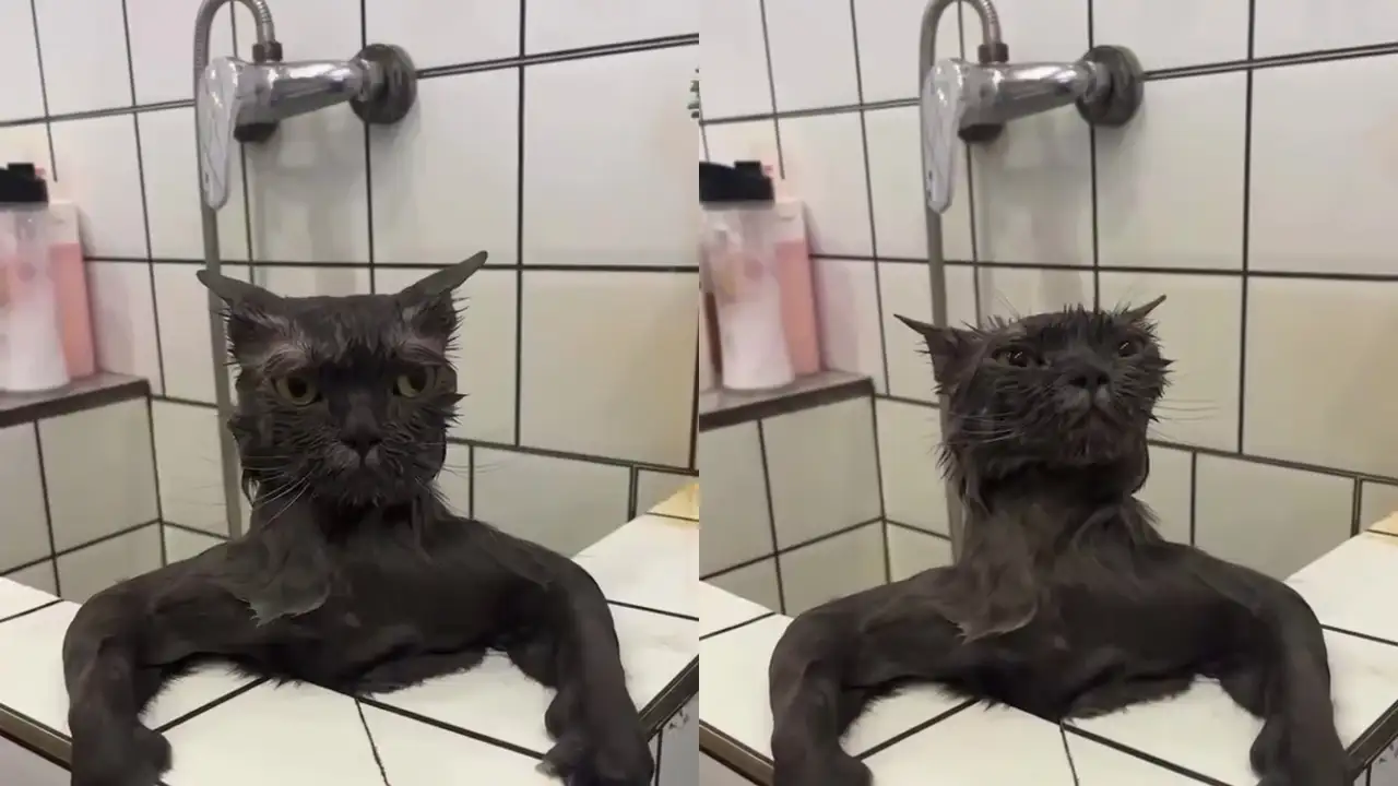 На видео запечатлен кот после душа, который выглядит одновременно недовольным и гордым собой. Его выражение лица говорит о том, что он не в восторге от водных процедур, но в то же время он осознает свою привлекательность после мытья.