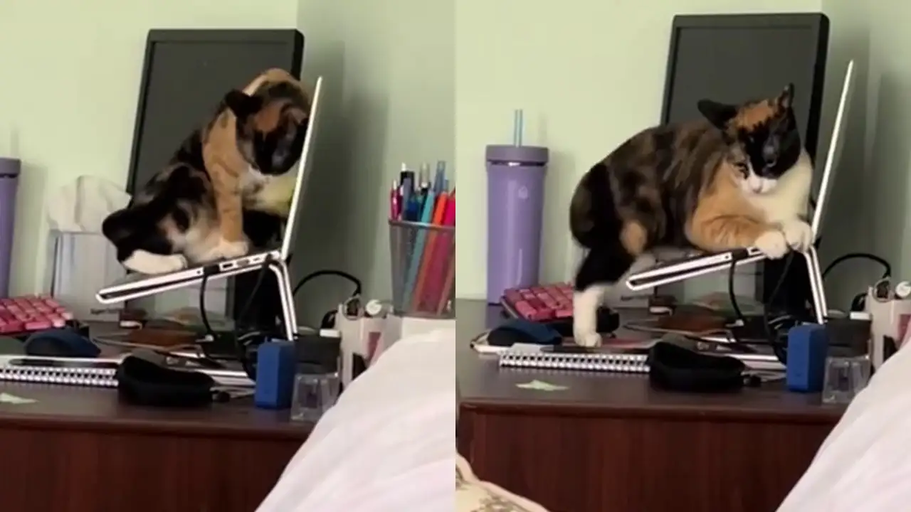 Этот ролик показывает забавную попытку домашнего кота найти комфортное место для отдыха. Животное решило устроиться прямо на ноутбуке, который, к слову, стоял на специальной подставке под ощутимым наклоном.