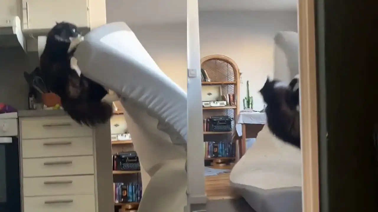 Кот на этом видео решает покорить матрас, но его попытка заканчивается комичным фиаско. Он с трудом залезает на поверхность и в итоге падает вместе с матрасом на пол. Сцена вызывает смех у зрителей, особенно когда другой кот испуганно убегает от неожиданного падения.