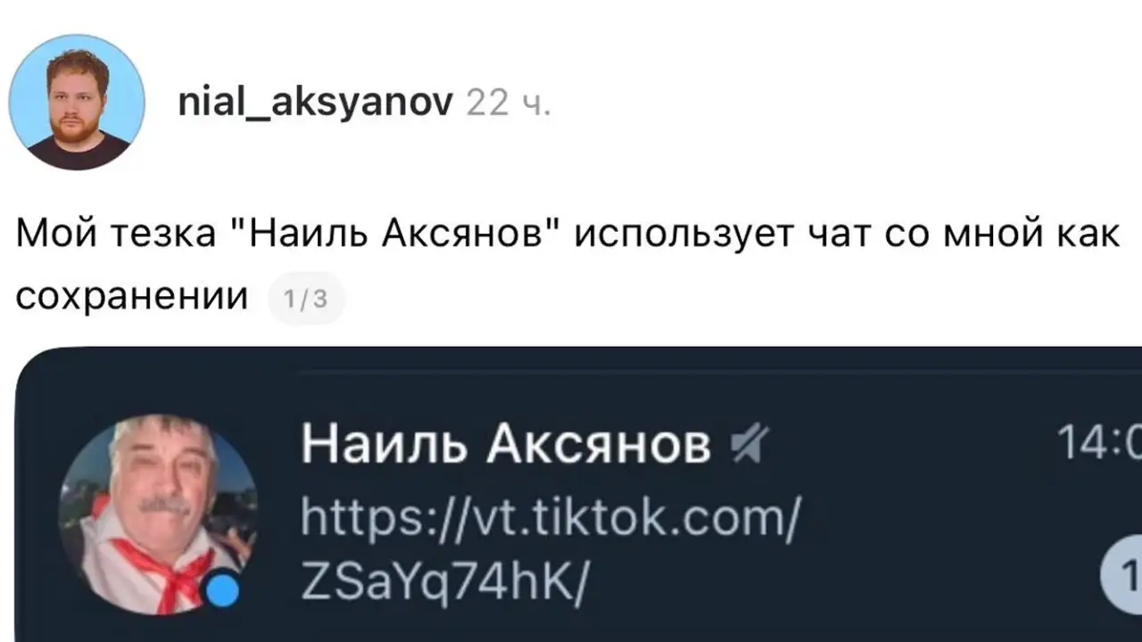 Что делать, если ваш чат в мессенджере кто-то использует как личное хранилище файлов? С такой проблемой столкнулся Наиль Аксянов: его тезка преклонных лет отправляет в их диалог скриншоты, видео и фотографии документов, видимо, считая это «Избранным». Ответ на сообщения парня оказался невероятным: