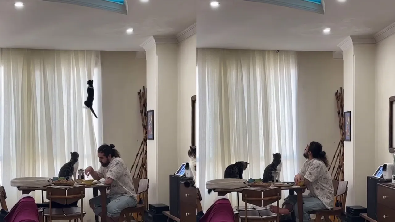 Парень из этого видео продемонстрировал на своем примере, что такое титаническое терпение, когда во время трапезы коты окружили его, а один вообще решил устроить вакханалию на шторе. Все это время хозяин сидел с выражением лица, как бы говорящим: «Мне этот мир уже абсолютно понятен…»