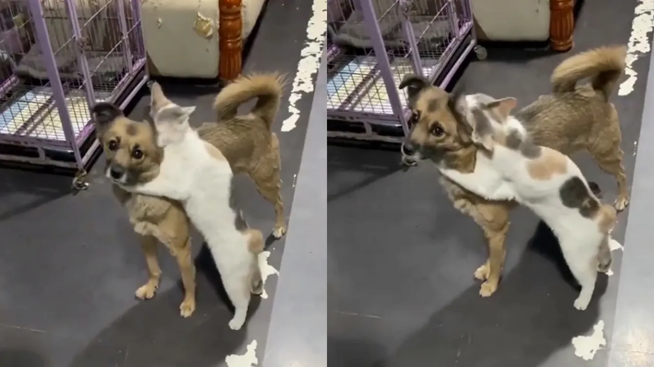 На этом видео заснято счастливое воссоединение питомцев после двухнедельной разлуки. Кот радостно обнимает найденного пса, всем своим видом показывая, как он скучал.