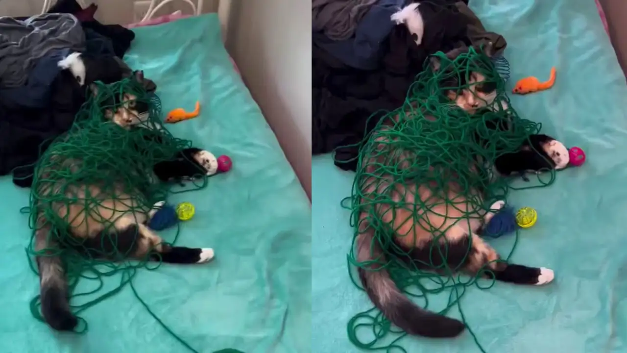 На экране появляется кот, полностью замотанный в клубок ниток. Он выглядит одновременно забавно и беспечно, словно сам не понимает, как оказался в такой ситуации.