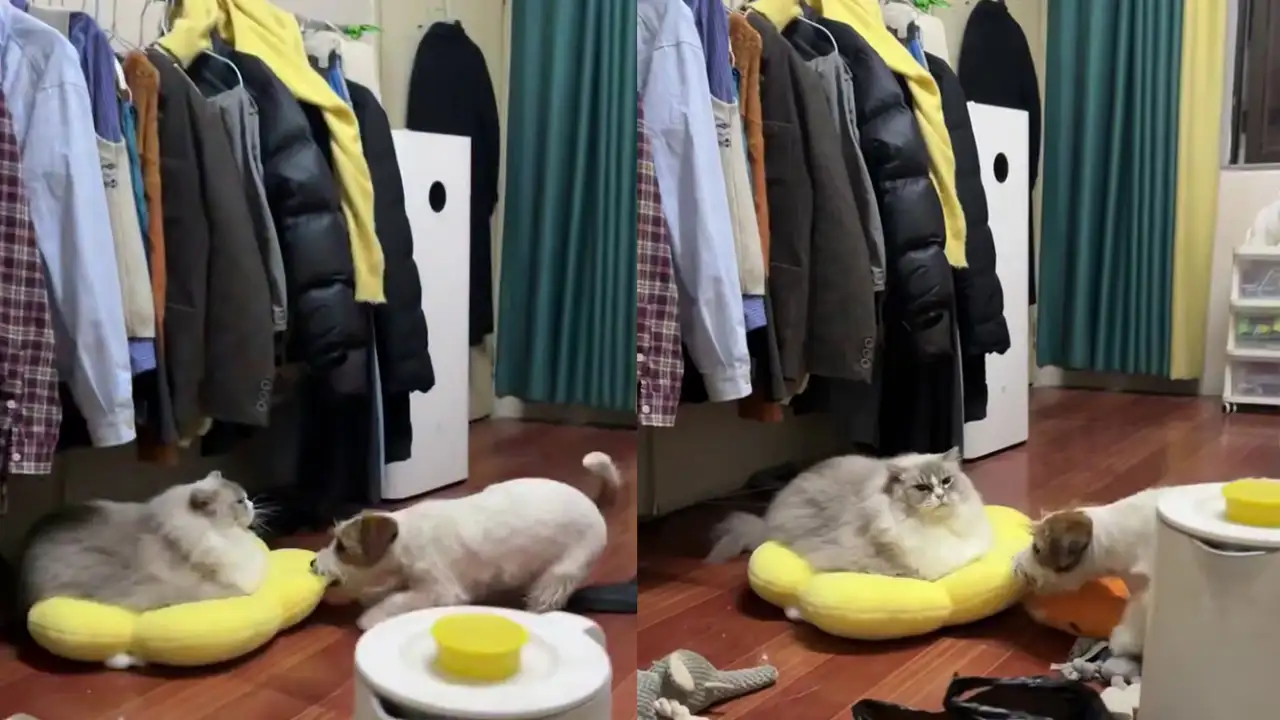 В этом видео собака решительно пытается завладеть лежанкой, на которой мирно устроился кот. Смешные попытки пса отобрать уютное место вызывают улыбку, ведь кот, словно истинный философ, остается невозмутимым. Он даже не шевелится, продолжая наслаждаться своим комфортом.