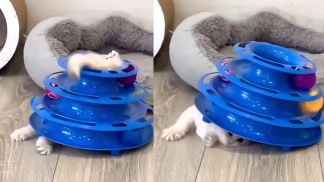 Котенок, столкнувшийся с новой игрушкой — пирамидкой-горкой для шариков, оказался в комическом замешательстве, достойном лучших комедий. Маленький пушистик получил этот хитроумный подарок от любимых хозяев, но вместо того чтобы гонять шарики по спиралям, он решил, что пирамидка — это его личный космический скафандр.