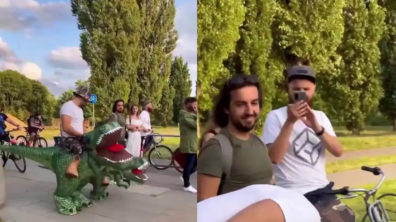 Папа с сыном решили развеселить окружающих и нарядились в костюмы наездников динозавров! Они весело гуляли по улицам, привлекая взгляды прохожих и вызывая улыбки на лицах людей.