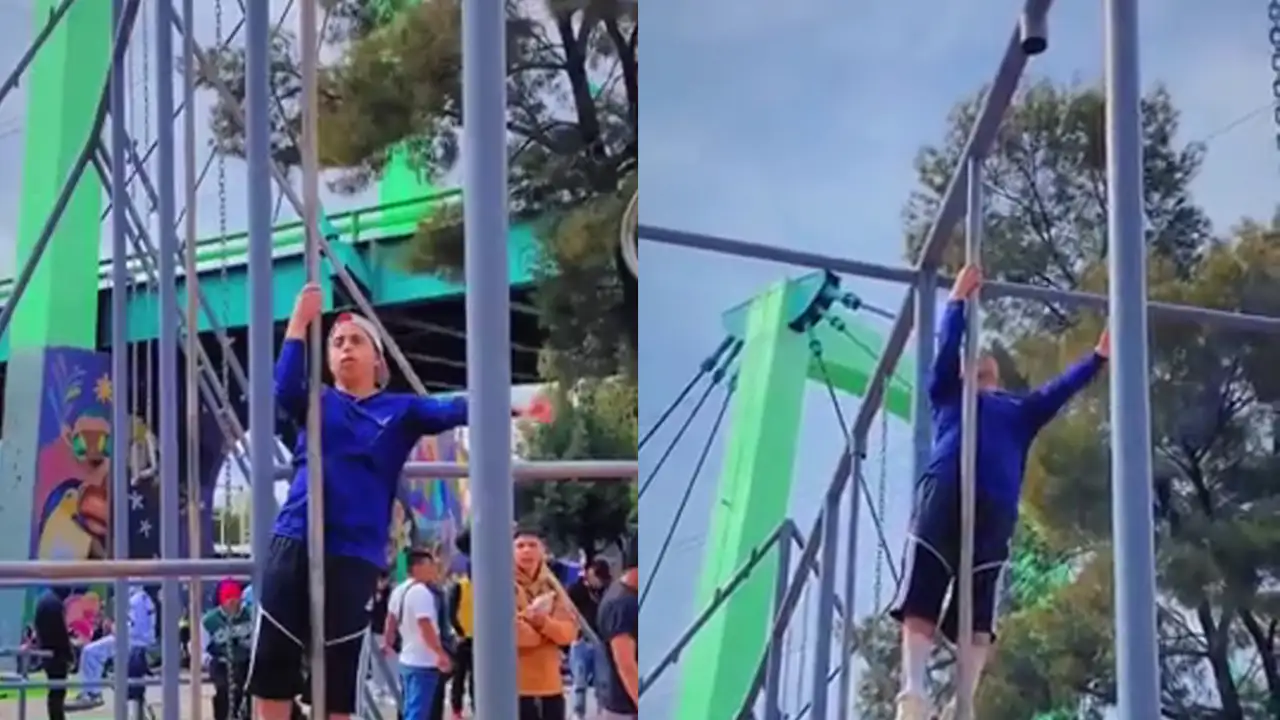 Парень на спортивной площадке демонстрирует невероятные акробатические навыки, поднимаясь и опускаясь на руках на шесте. Его контроль над телом вызывает восхищение: каждое движение плавное и уверенное.