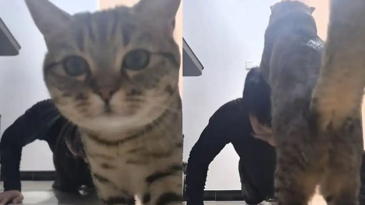 Парень решил снять свою домашнюю тренировку и стал свидетелем того, как его кот превратил занятия в настоящее шоу. Кот сначала проявляет интерес к камере, а затем решает помочь хозяину с отжиманиями, встав на его голову.