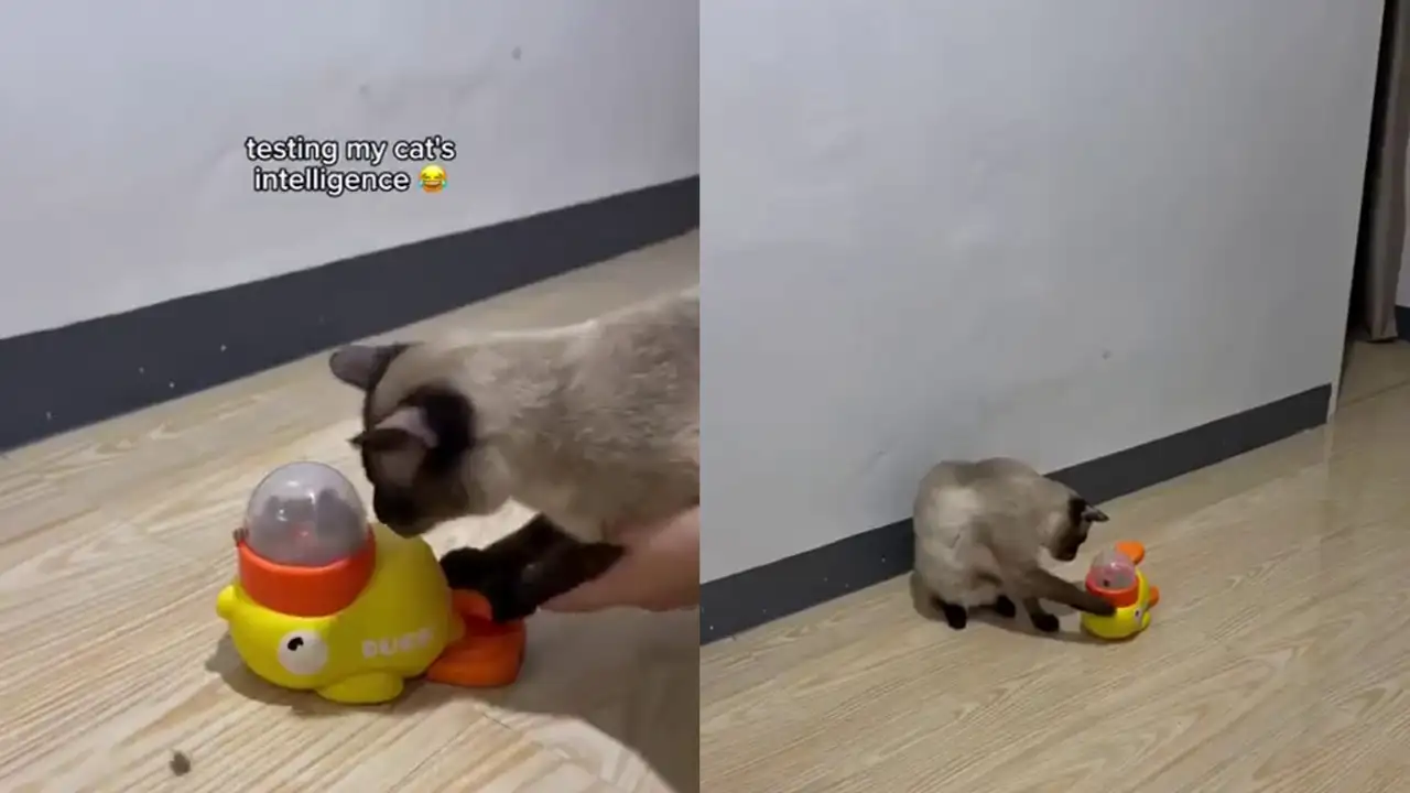 В этом забавном видео хозяйка решила развлечь своего кота, показав ему новую игрушку, в которой нужно нажимать на кнопку лапами, чтобы получить несколько штучек корма. Однако кот оказался не так прост!