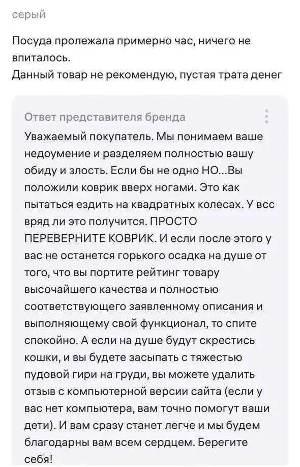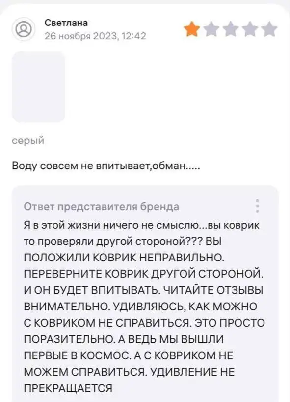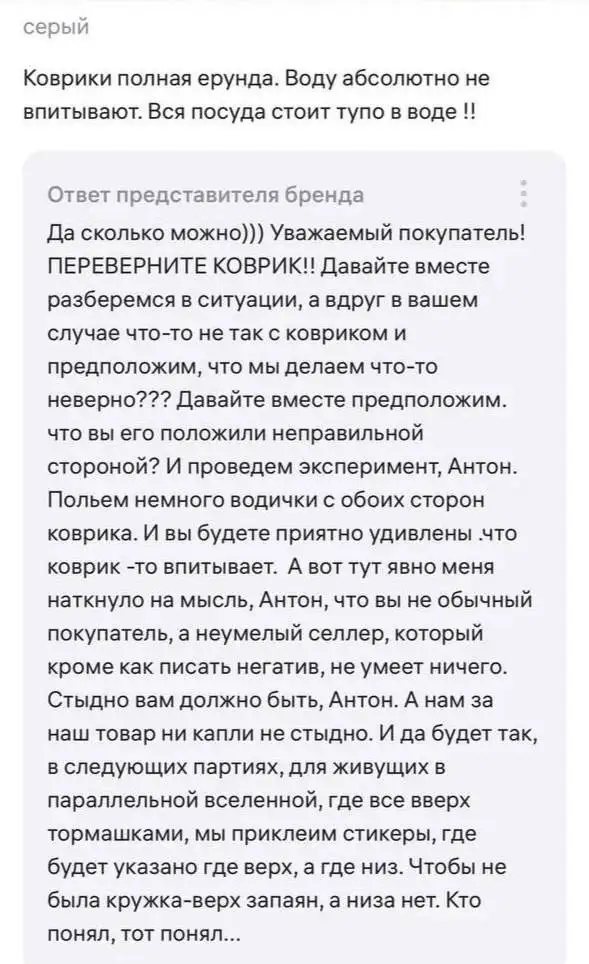 Конфликт на Wildberries начался с потока жалоб от пользователей на неспособность ковриков впитывать влагу. Не выдержав напора недовольных клиентов, продавец, который сначала поддерживал вежливый тон, в конце концов сорвался.
