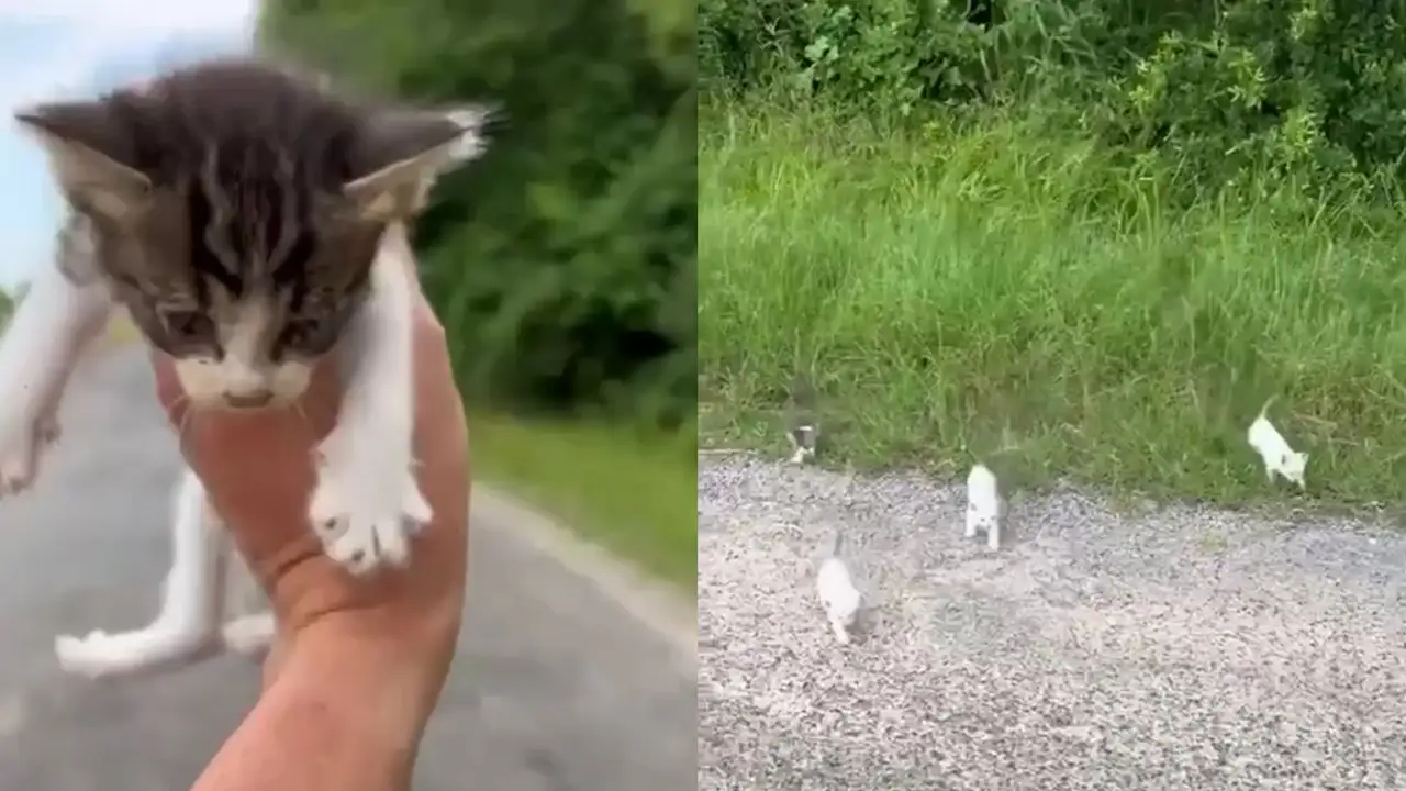 Мужчина, остановившись на дороге, заметил одинокого котенка и решил помочь. Он подошел, но внезапно оказался в окружении целой стаи котят, которые выбежали из травы. Эти пушистые создания с любопытством и игривостью начали исследовать нового знакомого.
