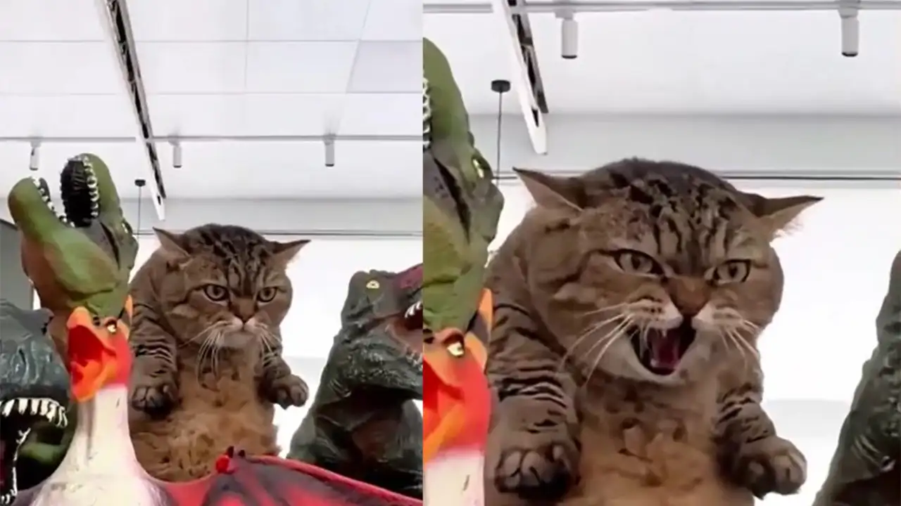Кот из этого видео не подписывался на участие в доисторическом театре, но кто его спрашивал. Его хозяин соорудил из пластиковых динозавров мини-парк Юрского периода прямо в комнате, а в центре композиции оказался пушистый «тираннозавр» с недовольной мордой и талантом к экспромту. Он рычит, скалится и недвусмысленно дает понять, что роль злого ящера вполне ему подходит.