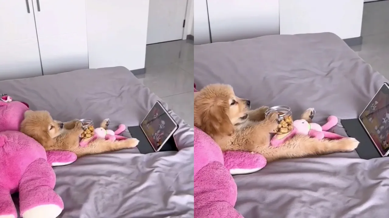 Малютка удобно устроился на кроватке, поедая вкусняшки за просмотром мультфильмов про своих сородичей. Разве можно представить себе отдых лучше?