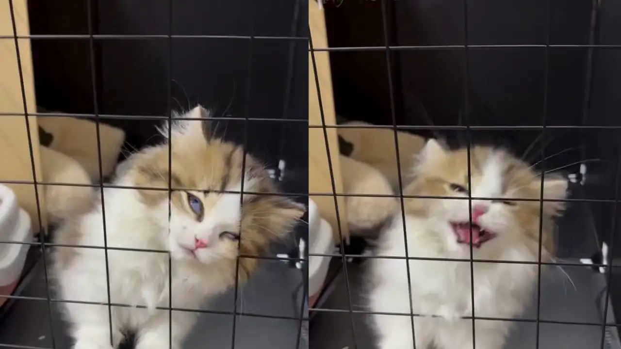 В этом видео мы видим котенка, который находится в клетке и громко мяукает, пытаясь привлечь внимание. Он решает просунуть голову сквозь прутья, но у него это не получается, и он на мгновение застывает в таком положении, словно задумавшись о своей ситуации.