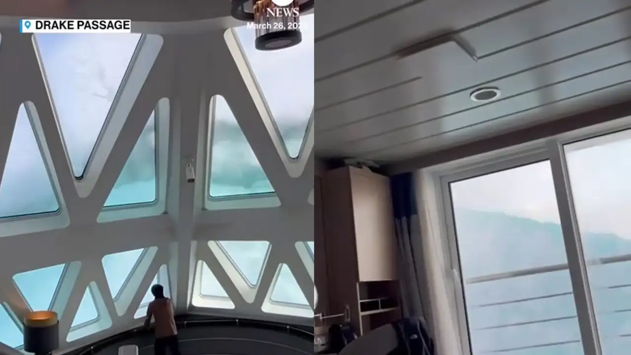 Пассажирское судно столкнулось с мощными волнами во время возвращения из Антарктиды через пролив Дрейка. Видео снято изнутри корабля и показывает потрясающие моменты шторма — огромные волны бьют по борту судна, создавая эффектное зрелище.